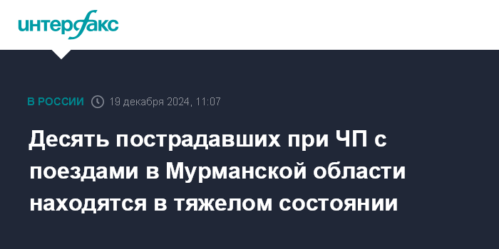 Москва. 19 декабря. INTERFAX.RU - Десять пострадавших в результате столкновения пассажирского и грузового поездов в Мурманской области находятся в тяжелом состоянии, сообщил помощник министра здравоохранения РФ Алексей Кузнецов.