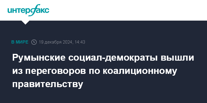 Москва. 19 декабря. INTERFAX.RU - Социал-демократическая партия Румынии (СДП) отказалась от формирования коалиционного прозападного правительства с другими прошедшими в парламент проевропейскими партиями, сообщает Bloomberg.