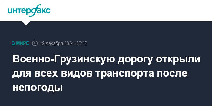 "В связи с расчисткой дорожного полотна на территории Грузии, возможностью обеспечения безопасного проезда автотранспортных средств (...) разрешено движение всех видов автотранспортных средств на участке Владикавказ - населенный пункт Ларс - в обоих направлениях с 22:30 по Москве 19 декабря 2024 года", - говорится в сообщении.