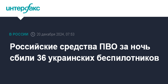 Москва. 20 декабря. INTERFAX.RU - За прошедшую ночь силы ПВО уничтожили 36 беспилотников ВСУ в Белгородской и Брянской областях, а также над акваторией Черного моря, сообщили в министерстве обороны России.
