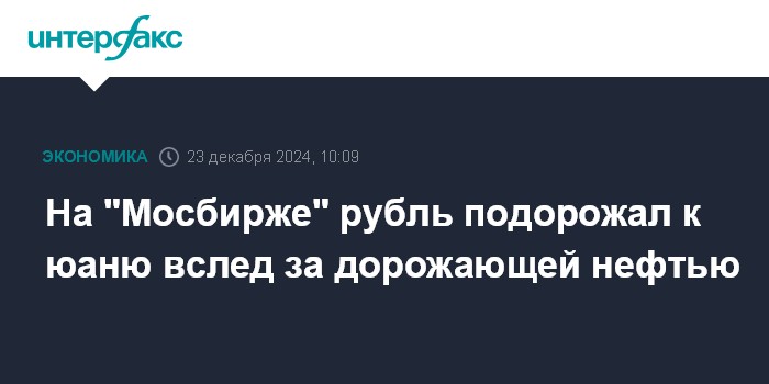 Москва. 23 декабря. INTERFAX.RU - Утром в понедельник на "Московской бирже" рубль подорожал к юаню на фоне дорожающей нефти.