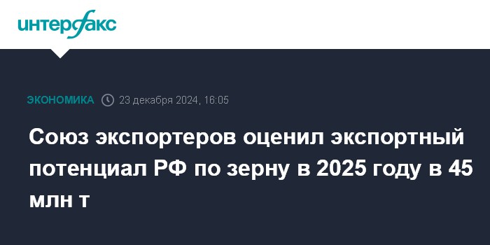 "По итогам первого заседания экспертный комитет сделал предварительную оценку экспортного потенциала российского зерна в 2025 году, в оптимистичном сценарии, порядка 45 млн тонн, в том числе 40 млн тонн пшеницы", - говорится в сообщении союза.