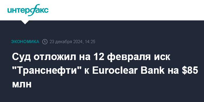 Москва. 23 декабря. INTERFAX.RU - Арбитражный суд Москвы отложил на 12 февраля предварительное заседание по иску "Транснефти" к Euroclear Bank SA/NV (Брюссель) о взыскании $85 млн, следует из информации на сайте суда.