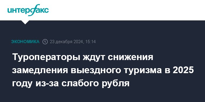 Москва. 23 декабря. INTERFAX.RU - Бронирование зарубежных туров в четвертом квартале затормозилось из-за ослабления курса рубля, курс будет влиять на рынок выездного туризма и в 2025 году, из-за чего его рост вряд ли превысит 5-10%, прогнозируют в Ассоциации туроператоров России.