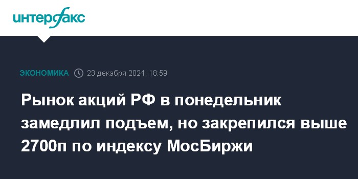 Рынок акций РФ в понедельник замедлил подъем, но закрепился выше 2700п по индексу МосБиржи