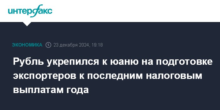Москва. 23 декабря. INTERFAX.RU - Китайский юань упал на Московской бирже по итогам торгов в понедельник, рубль уверенно вырос благодаря подготовке экспортеров к последним налоговым выплатам года. Согласно календарю Федеральной налоговой службы, в этом месяце единый день налоговых выплат был перенесен с 28-го на 25-е число. Таким образом в среду в бюджет должны быть перечислены налог на прибыль, НДПИ, акцизы и страховые взносы.