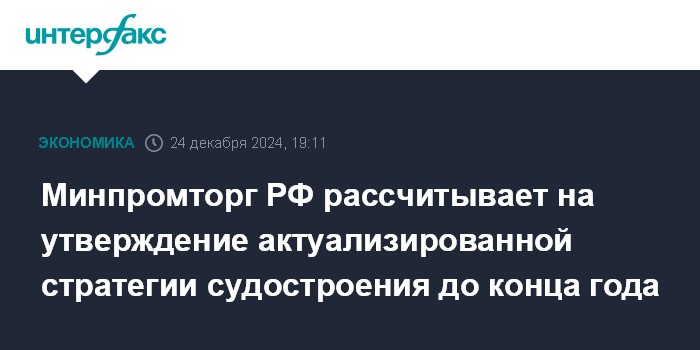 Москва. 24 декабря. INTERFAX.RU - Обновленная стратегия развития судостроительной промышленности на период до 2035 года, как ожидается, будет утверждена правительством РФ до конца текущего года, сообщил глава Минпромоторга РФ Антон Алиханов журналистам.
