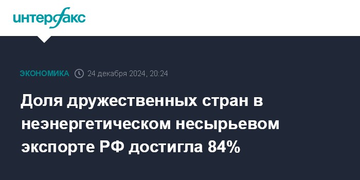 Москва. 24 декабря. INTERFAX.RU - Российские экспортеры увеличили поставки несырьевой неэнергетической продукции на рынки дружественных стран: в 2024 году доля этих направлений в несырьевом неэнергетического экспорте (ННЭ) из РФ составляет 84% против 81,8% в 2023 году и 60,5% в досанкционном 2021 году, сообщил журналистам глава Минпромторга РФ Антон Алиханов.
