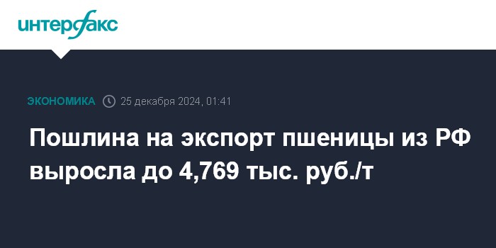 Москва. 25 декабря. INTERFAX.RU - Ставка пошлины на экспорт пшеницы из РФ с 25 декабря повысилась на 15,3%, до 4 тыс. 768,7 рубля с 4 тыс. 136,5 рубля за тонну неделей ранее, сообщает Минсельхоз.