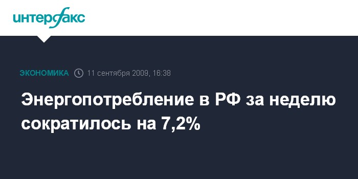 Москва. 11 сентября. INTERFAX.RU - Энергопотребление в РФ в период с 4 по 10 сентября сократилось на 7,2% по сравнению с прошлым годом, говорится в сообщении НП "Совет рынка". В то же время по сравнению с предыдущей неделей оно выросло на 2%. В 51 из 64 субъектов Федерации, объединенных в ценовые зоны оптового рынка, отмечено уменьшение электропотребления по сравнению с аналогичным периодом прошлого года.