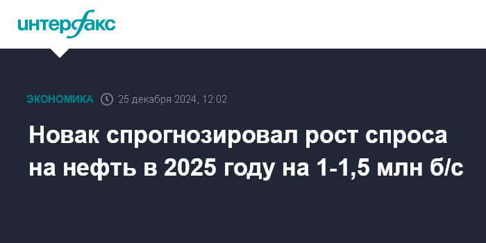 В начале декабря после заседания министров ОПЕК+ Новак говорил, что в 2024 году потребление нефти в мире увеличится на 1,4 млн б/с, а в 2025 году - на 1 млн б/с.