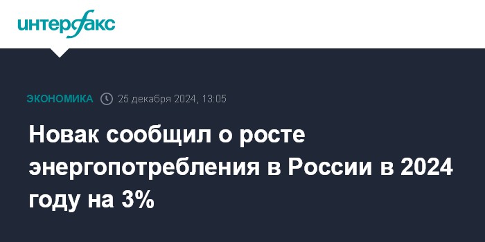 Москва. 25 декабря. INTERFAX.RU - В России в 2024 году рост энергопотребления составит 3% к результату 2023 года, сообщил вице-премьер Александр Новак телеканалу "Россия 24".