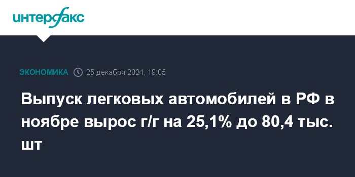 Москва. 25 декабря. INTERFAX.RU - Выпуск легковых автомобилей в РФ в ноябре 2024 года вырос в годовом выражении на 25,1% до 80,4 тыс. шт., снизившись на 11,8% по сравнению с октябрем, сообщила Федеральная служба государственной статистики (Росстат).