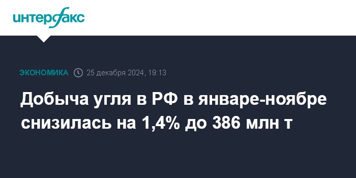 Москва. 25 декабря. INTERFAX.RU - Добыча угля в РФ в январе-ноябре 2024 г. снизилась на 1,4% по сравнению с аналогичным периодом прошлого года – до 386 млн т, сообщил Росстат.