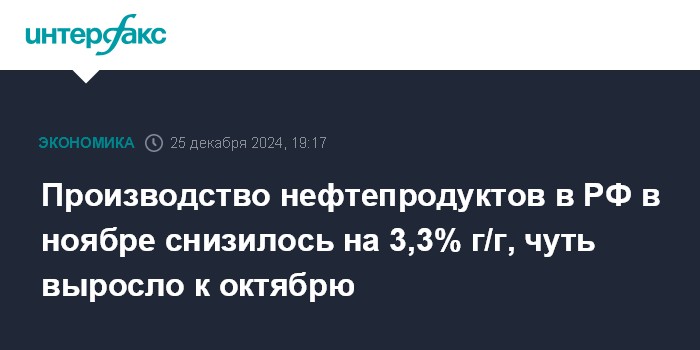 Производство нефтепродуктов в РФ в ноябре снизилось на 3,3% г/г, чуть выросло к октябрю