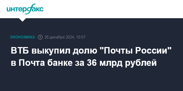 Москва. 26 декабря. INTERFAX.RU - ВТБ завершил сделку по выкупу 49,99% акций Почта банка у "Почты России" за 36 млрд рублей, говорится в сообщении группы.