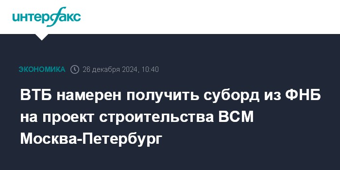 Москва. 26 декабря. INTERFAX.RU - ВТБ планирует получить суборд из Фонда национального благосостояния (ФНБ) в рамках финансирования проекта строительства высокоскоростной магистрали (ВСМ) Москва - Санкт-Петербург, заявил журналистам первый зампред ВТБ Дмитрий Пьянов.