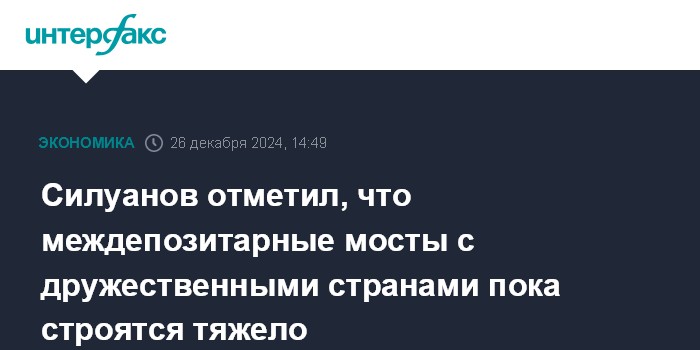 Москва. 26 декабря. INTERFAX.RU - Российские власти продолжают работать над выстраиванием междепозитарной инфраструктуры с дружественными странами, но санкционные риски создают сложности, заявил министр финансов Антон Силуанов.