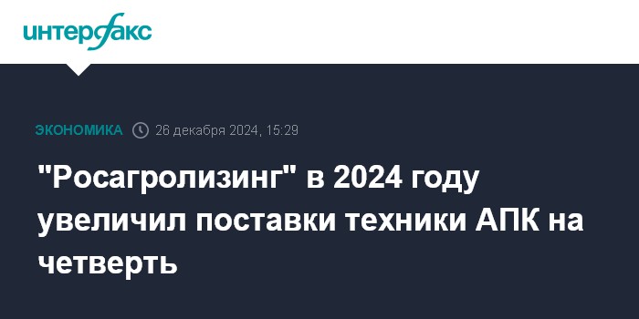 Москва. 26 декабря. INTERFAX.RU - "Росагролизинг" в 2024 году поставил АПК РФ более 18 тыс. единиц техники и оборудования, что на 25% больше, чем в прошлом году, сообщается в пресс-релизе компании.