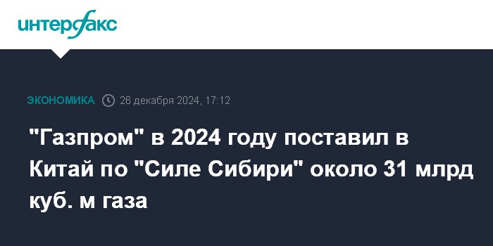 Москва. 26 декабря. INTERFAX.RU - "Газпром" в 2024 году поставил в Китай по газопроводу "Сила Сибири" около 31 млрд куб. м газа, сообщил на селекторном совещании председатель правления компании Алексей Миллер.