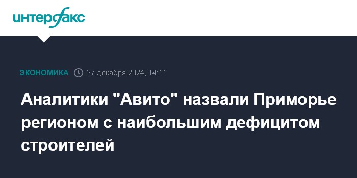 Москва. 27 декабря. INTERFAX.RU - В 2024 году наибольший дефицит кадров в строительной отрасли наблюдадся в Приморском крае, показало исследование "Авито. Работа".