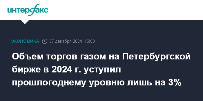 Объем торгов газом на Петербургской бирже в 2024 г. уступил прошлогоднему уровню лишь на 3%