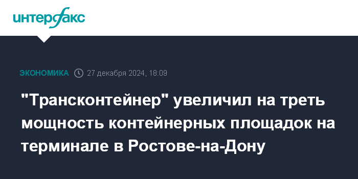 Москва. 27 декабря. INTERFAX.RU - ПАО "Трансконтейнер" (входит в группу "Дело") завершило модернизацию контейнерных площадок на терминале Ростов-Товарный (Ростов-на-Дону). Об этом сообщила "Интерфаксу" первый заместитель министра транспорта региона Инна Володина.
