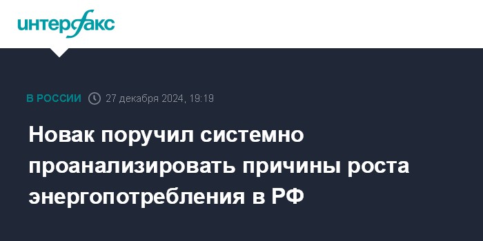 Москва. 27 декабря. INTERFAX.RU - Вице-премьер РФ Александр Новак поручил Минэнерго РФ, "Системному оператору" и "Совету рынка" провести системный анализ причин роста энергопотребления в регионах РФ, говорится в сообщении правительства РФ по итогам заседания правкомиссии по электроэнергетике.