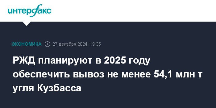 Москва. 27 декабря. INTERFAX.RU - ОАО "РЖД" обеспечит вывоз не менее 54,1 млн т угля Кемеровской области в 2025 году, а также вывоз угля других регионов на условиях правила недискриминационного доступа к железнодорожным направлениям. Об этом сообщило правительство РФ по итогам заседания подкомиссии по повышению устойчивости финсектора экономики и отдельных отраслей.