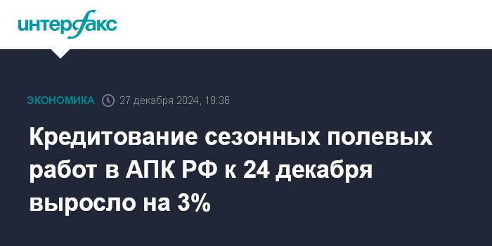 Кредитование сезонных полевых работ в АПК РФ к 24 декабря выросло на 3%