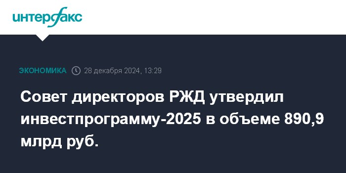 Москва. 28 декабря. INTERFAX.RU - Совет директоров ОАО "РЖД" утвердил инвестиционную программу компании на 2025 г. в объёме 890,9 млрд руб., сообщил холдинг.
