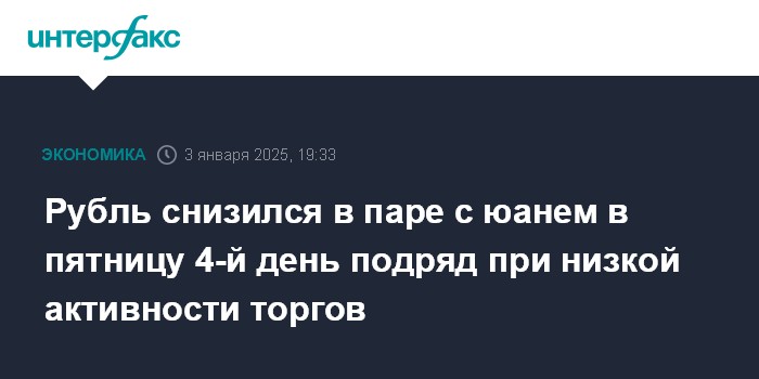 Москва. 3 января. INTERFAX.RU - Китайский юань умеренно подрос по итогам первых в 2025 году торгов на Московской бирже; рубль подешевел в пятницу на фоне снижения объема продаж валютной выручки экспортерами в официальный выходной день в России и нестабильной ситуации на европейских фондовых биржах.