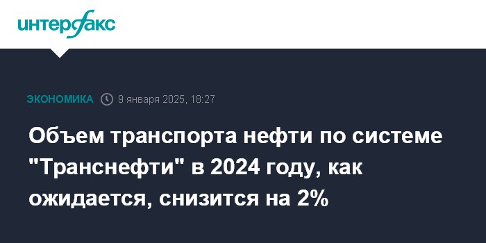 Москва. 9 января. INTERFAX.RU - Объем транспортировки нефти по магистральным нефтепроводам "Транснефти" по итогам 2024 года по сравнению с 2023 годом, как ожидается, снизится примерно на 2%, что связано с принятыми Россией обязательствами по сокращению объема добычи в рамках соглашения ОПЕК+, сообщает корпоративный журнал компании со ссылкой на вице-президента монополии Сергея Андронова.