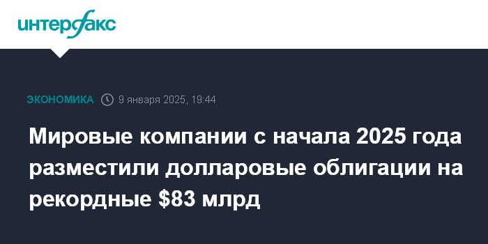 Москва. 9 января. INTERFAX.RU - Объемы размещений долларовых корпоративных облигаций инвестиционного и неинвестиционного уровней с начала 2025 года по 8 января составили рекордные $83,4 млрд, сообщает Financial Times со ссылкой на данные LSEG.