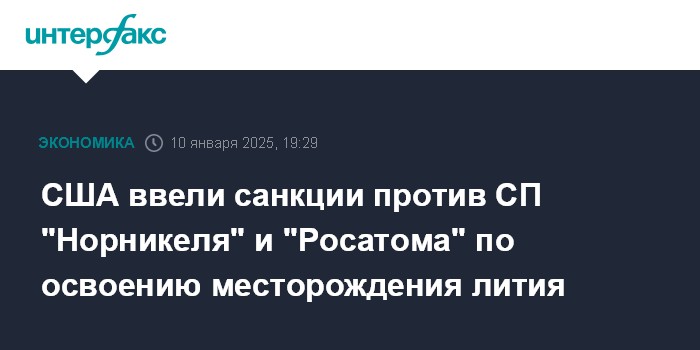Москва. 10 января. INTERFAX.RU - США ввели санкции против ООО "Полярный литий", совместного предприятия "Норникеля" и "Росатома" по освоению Колмозерского литиевого месторождения в Мурманской области. Об этом сообщило в пятницу OFAC (Office of Foreign Assets Control, подразделение Минфина США, отвечающее за правоприменение в области санкций).