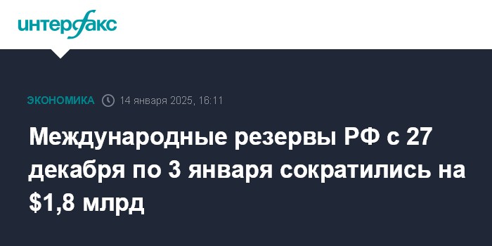 Международные резервы РФ с 27 декабря по 3 января сократились на $1,8 млрд