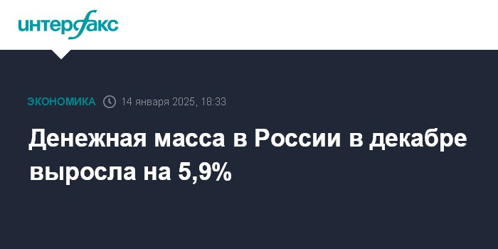 Москва. 14 января. INTERFAX.RU - Денежная масса (агрегат М2) в России в декабре 2024 года увеличилась на 5,9%, до 117,5 трлн рублей, после роста в ноябре на 1,9%, сказано в информации на сайте Банка России, подготовленной на основе оперативных данных о динамике денежных агрегатов.