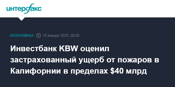 Москва. 15 января. INTERFAX.RU - Объем застрахованного ущерба от лесных пожаров на юге американского штата Калифорния может достичь $40 млрд, полагают аналитики инвестбанка Keefe Bruyette & Woods (KBW).