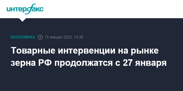 Москва. 15 января. INTERFAX.RU - Продажа зерна из государственного интервенционного фонда (товарные интервенции), прерванная в конце декабря, продолжится с 27 января 2025 года. Об этом сообщает Национальная товарная биржа (НТБ, входит в группу Московская биржа) со ссылкой на решение Минсельхоза от 13 января 2025 года и АО "Объединенная зерновая компания" (агент по распоряжению зерном госфонда).