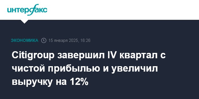 Москва. 15 января. INTERFAX.RU - Citigroup Inc., входящий в число крупнейших банков США, завершил четвертый квартал 2024 года с чистой прибылью, выручка выросла на 12,3%.