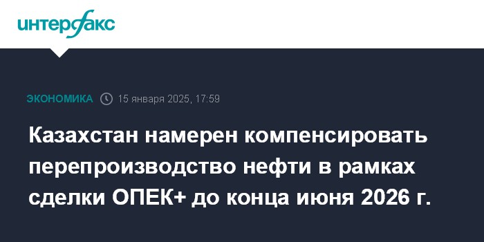 Москва. 15 января. INTERFAX.RU - Казахстан перенес сроки компенсации перепроизводства нефти в рамках сделки ОПЕК+ до конца июня 2026 года, сообщили агентству "Интерфакс-Казахстан" в Минэнерго республики.
