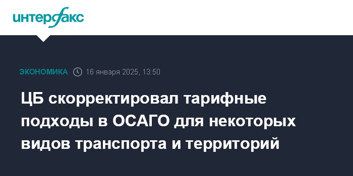 Москва. 16 января. INTERFAX.RU - Банк России скорректировал тарифные подходы в ОСАГО для некоторых категорий транспорта и территорий РФ с 27 января 2025 года, сообщил регулятор в четверг. Изменения вводятся указанием ЦБ.