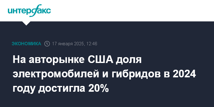Москва. 17 января. INTERFAX.RU - В США в 2024 году доля электромобилей и гибридов в общем объеме продаж автомобилей составила рекордные 20%, по данным Motor Intelligence.