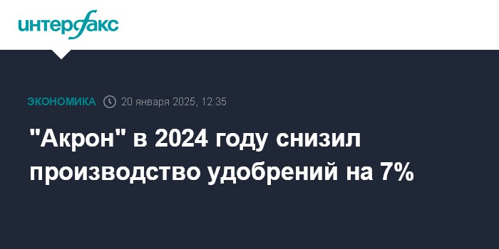 Москва. 20 января. INTERFAX.RU - "Акрон" в 2024 году снизил производство удобрений на 7%, до 6,641 млн тонн, сообщила компания.