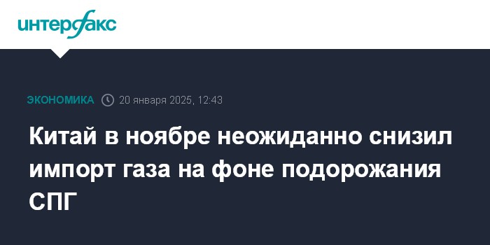 Москва. 20 января. INTERFAX.RU - Ноябрь в китайской газовой статистике обычно был месяцем пикового импорта и обновления рекордов. Однако в 2024 году показатели заметно уступили как историческим рекордам этого месяца, так и пришедшимся на летние месяцы внутригодовым максимумам 2024 года. Причина может быть в сезонном сокращении притока газа из Центральной Азии и подорожании СПГ.