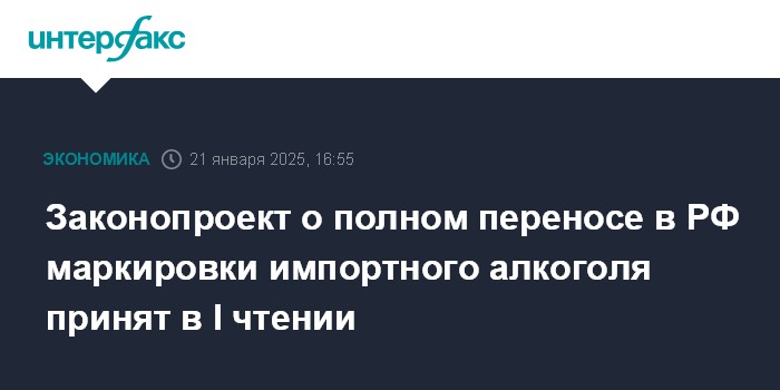 Москва. 21 января. INTERFAX.RU - Госдума приняла в первом чтении законопроект о полном переносе с 1 марта 2026 года маркировки импортной алкогольной продукции на территорию РФ, что должно упростить процедуру ввоза и контроля качества. Сейчас маркировать импортный алкоголь на складах в РФ возможно только в рамках эксперимента в отдельных регионах страны.