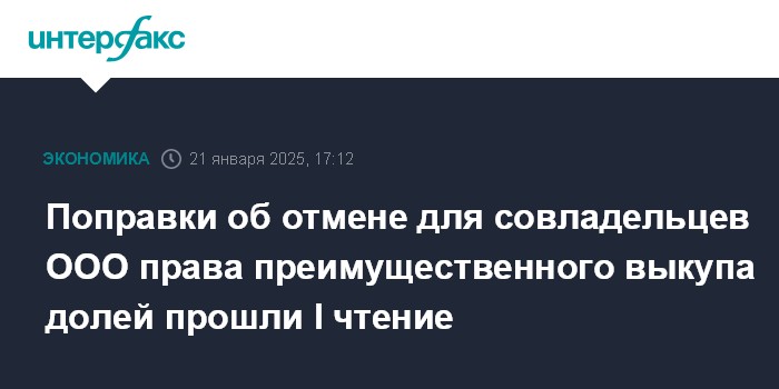 Москва. 21 января. INTERFAX.RU - Госдума приняла в первом чтении правительственный законопроект, разрешающий зарегистрированным в форме обществ с ограниченной ответственностью (ООО) компаниям отменить преимущественное право выкупа долей совладельцев.