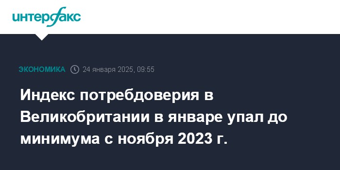 Москва. 24 января. INTERFAX.RU - Индекс потребительского доверия в Великобритании в январе упал на 5 пунктов, до минус 22 пунктов - минимума с ноября 2023 года, говорится в отчете аналитической компании NIQ GfK.
