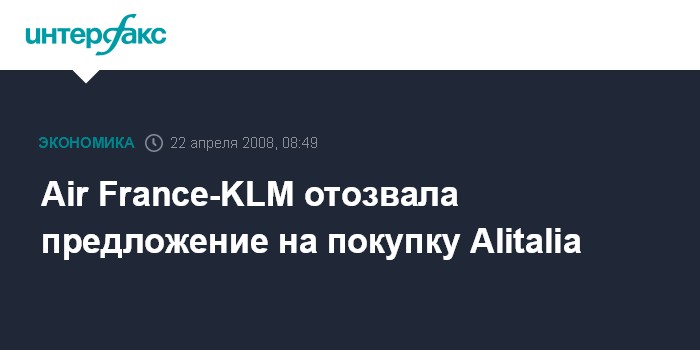 Лондон. 22 апреля. INTERFAX.RU - Альянс Air France-KLM официально отозвал свое предложение о покупке 49% акций убыточной итальянской авиакомпании Alitalia SpA.