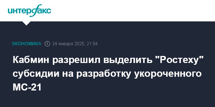Москва. 24 января. INTERFAX.RU - Правительство РФ утвердило постановление, позволяющее предоставить госкорпорации "Ростех" субсидии на разработку конструкторской документации по эскизному и техническому проекту укороченной модификации самолета МС-21. Текст документа размещен на официальном интернет-портале правовой информации.